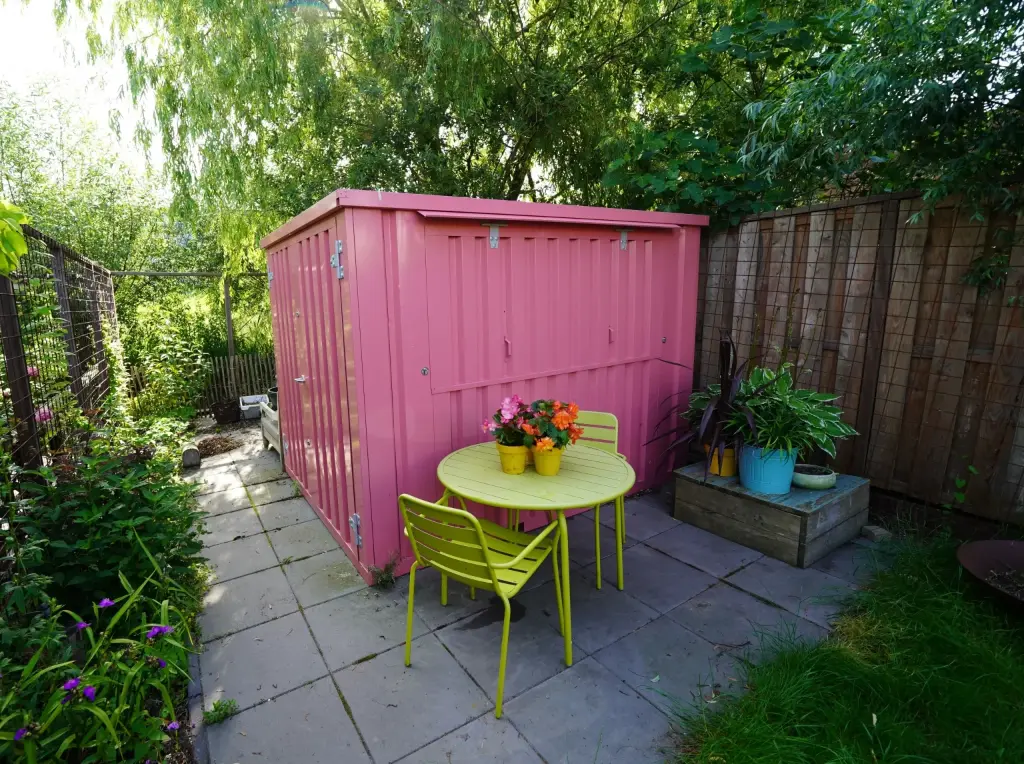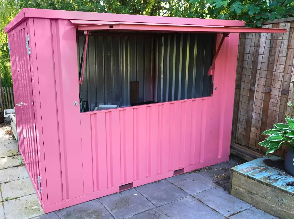 Le conteneur bar pliable rose mesure environ 3×2 mètres et possède un auvent pliable, les dimensions sont à peu près les mêmes qu’un conteneur pliable de 10 pieds. C’est idéal pour les personnes qui attendent d’être au sec et cela donne au conteneur l’aspect d’un vrai bar. L’auvent peut également être verrouillé, de sorte que le conteneur bar peut être laissé avec les affaires à l’intérieur en toute sécurité. De plus, une double porte sur le petit côté vous permet d’introduire des articles volumineux comme un baril de bière. Cela en fait la solution parfaite pour offrir un bar lors d’événements. Un conteneur bar simple mais solide dans une couleur amusante et accrocheuse comme le rose peut vraiment attirer tous les clients que vous désirez.