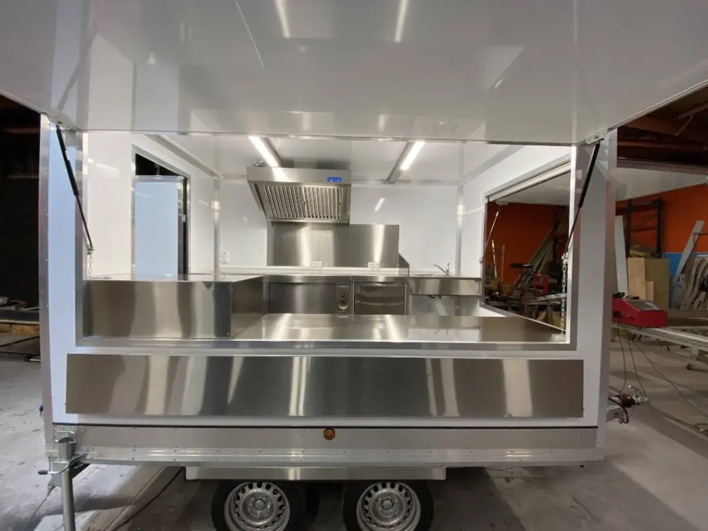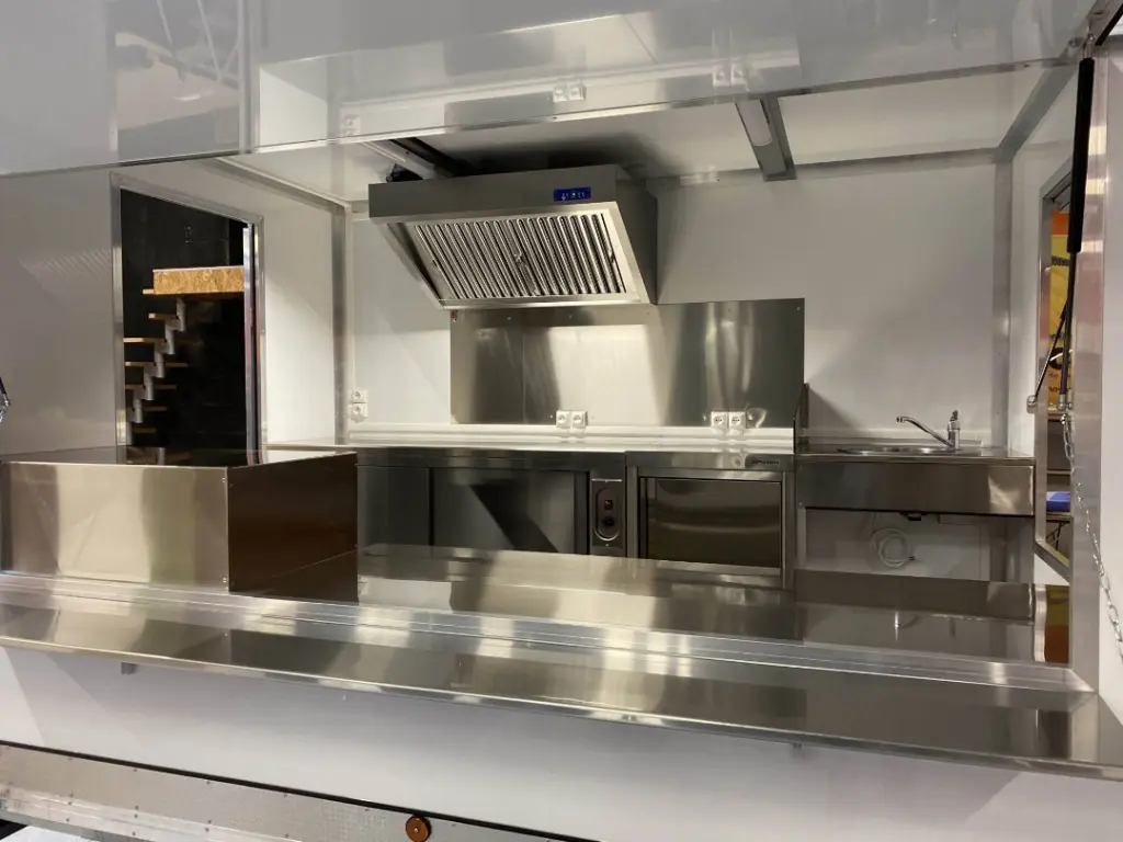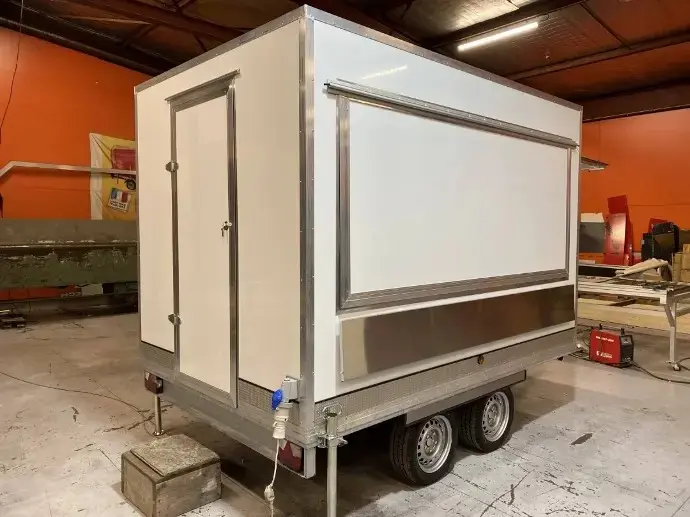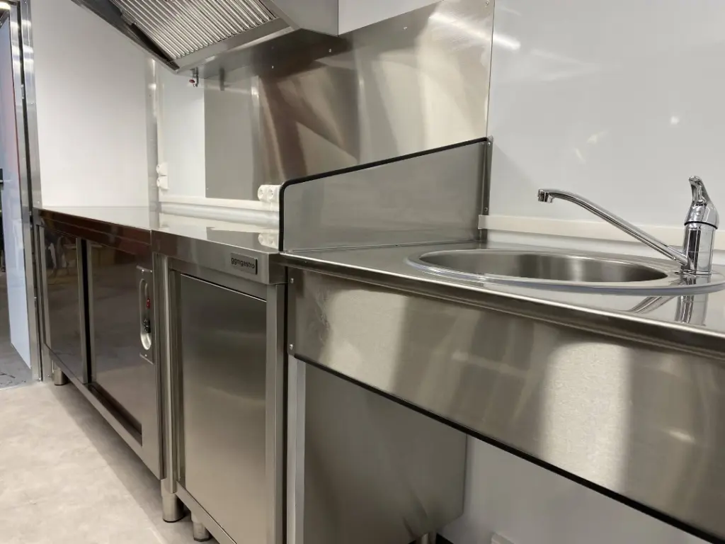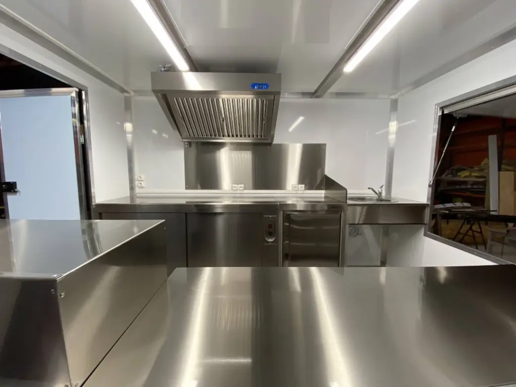 Nous proposons un équipement et une conception sur-mesure en installation dans la remorque (plan de travail inox, espace de stockage sec, chaud, froid, hotte, alimentation électrique, alimentation eau, alimentation gaz, équipements CHR…)