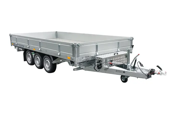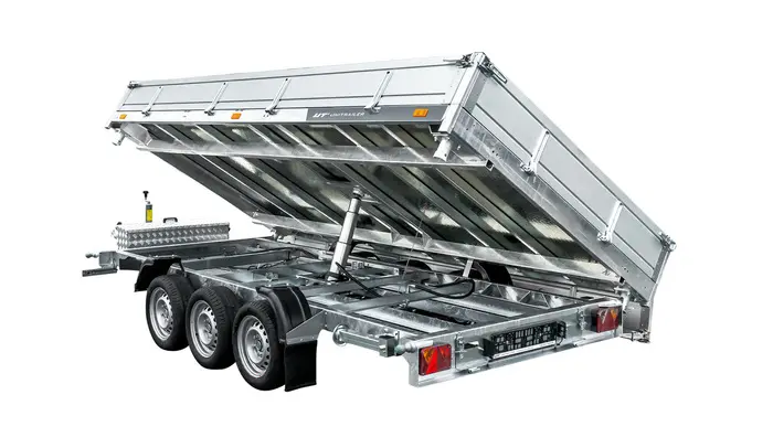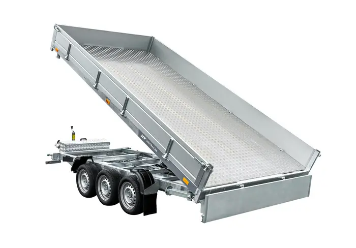 Léger, solide et multifonctionnel. Nous avons réussi à atteindre une capacité de charge étonnamment élevée de 2520 kg. Dans le même temps, le poids propre de cette remorque à trois essieux avec système de basculement électrique n’est que de 980 kg.