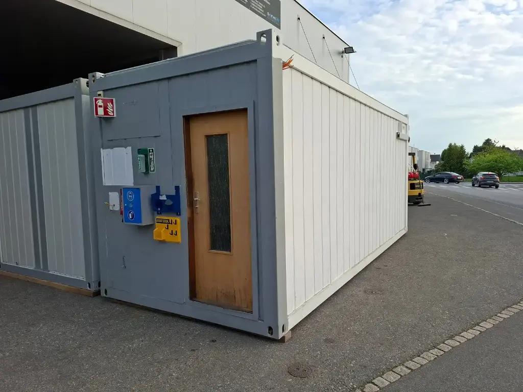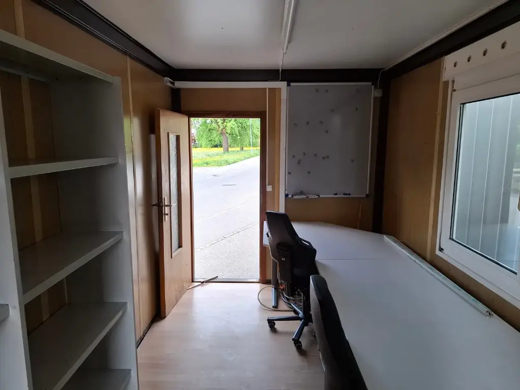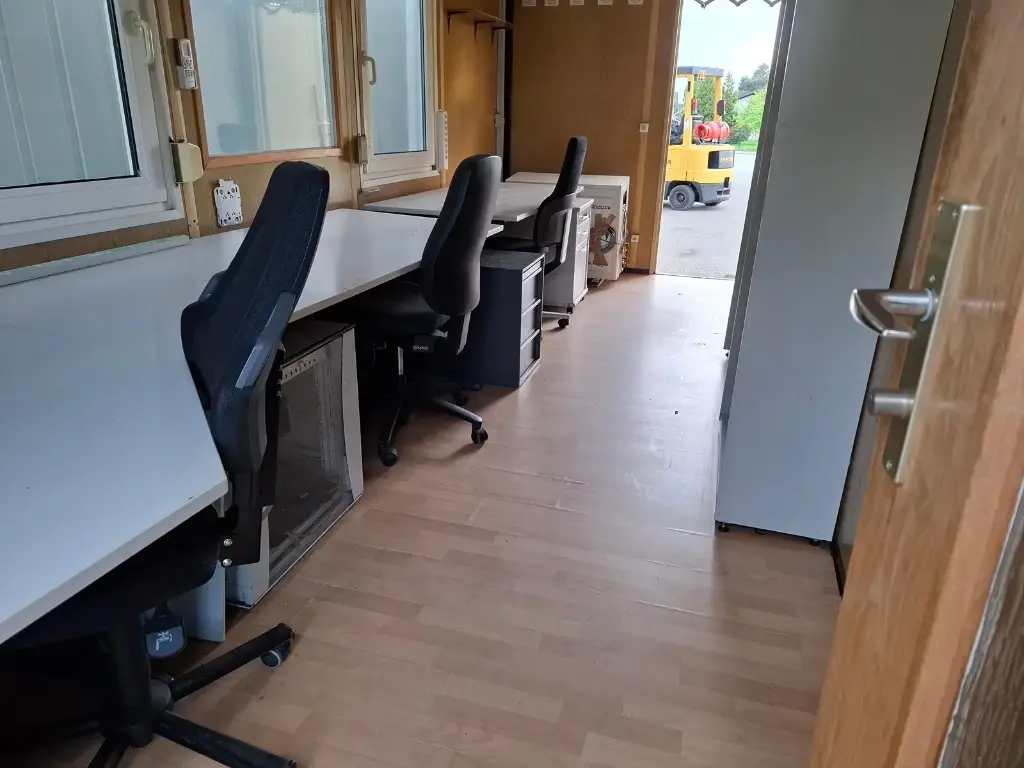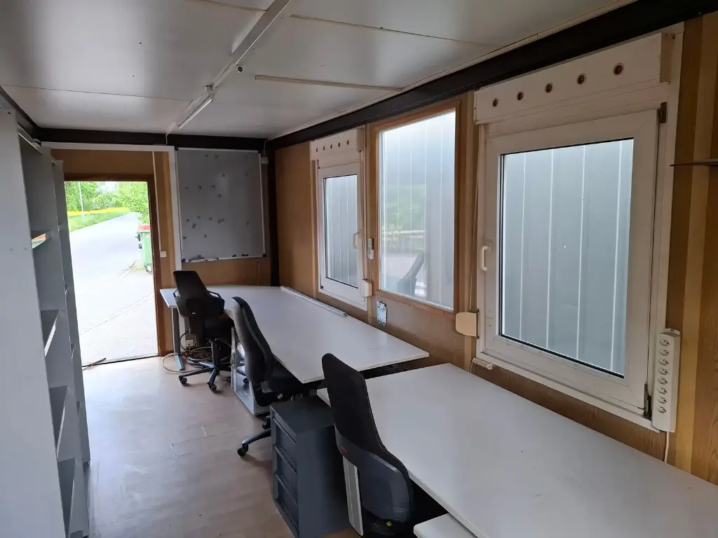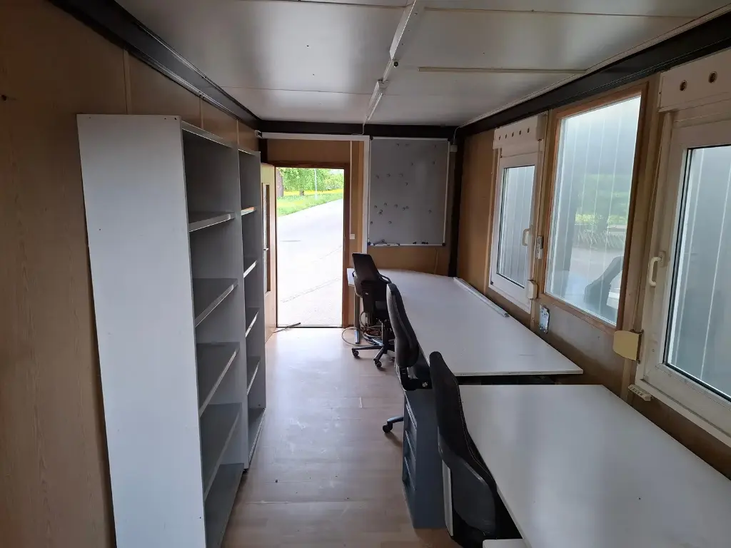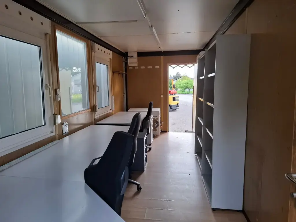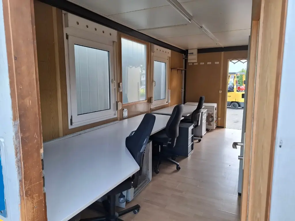 Conteneur de 20″ avec équipement de bureau. Deux fenêtres et deux portes chacune. Avec climatisation, éclairage + branchements